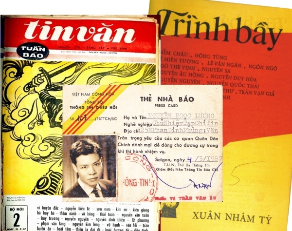 | Các ấn phẩm xuất bản trước 1975 tại Sài Gòn và Thẻ nhà báo do Tổng bộ Thông tin chiêu hồi Sài Gòn (cũ) cấp cho nhà báo Nguyễn Nguyên lúc ông làm chủ nhiệm Tạp chí Tin Văn - Ảnh: internet |