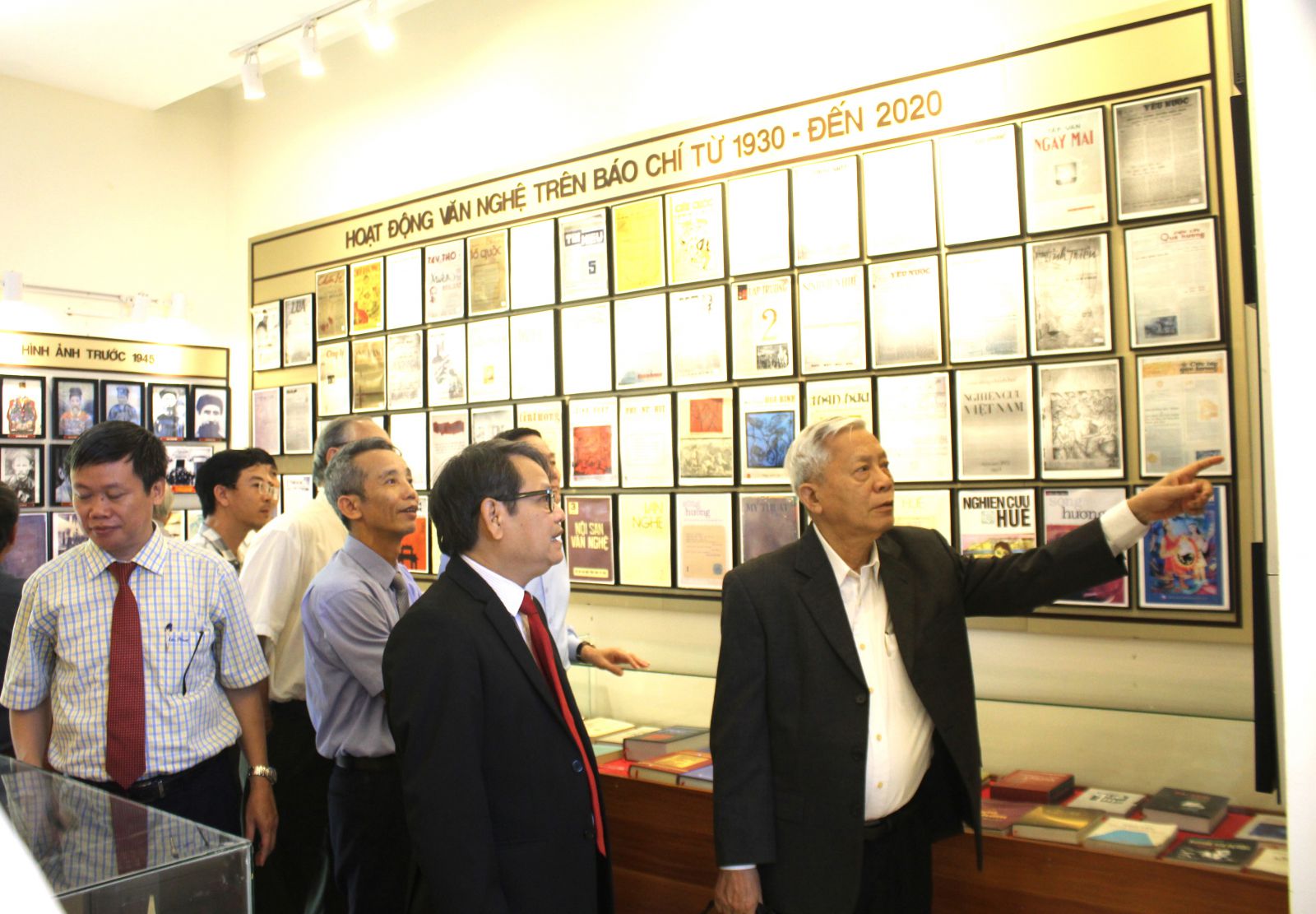 Một mảng trưng bày tái hiện sinh hoạt văn học nghệ thuật trên báo chí từ năm 1945 đến nay, với bìa của hàng chục tờ báo đã xuất bản tại Huế qua nhiều giai đoạn: thời kháng chiến chống Pháp, chống Mỹ, những năm xây dựng đất nước sau 1975 cho đến hôm nay. Đây là nơi hội tụ hình ảnh các tờ báo, tạp chí gắn liền với đời sống văn nghệ sĩ, trong đó có Tạp chí Sông Hương – một biểu tượng của văn nghệ Huế hiện đại.