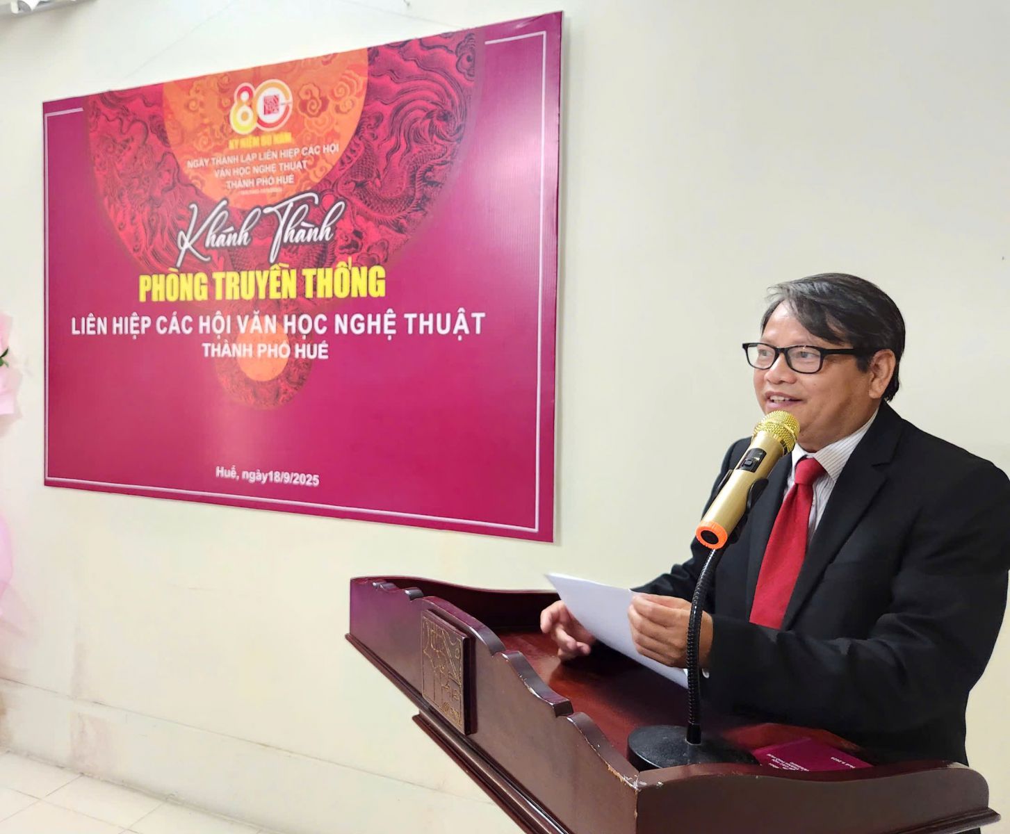 Phát biểu tại khánh thành Phòng Lưu niệm Văn học Nghệ thuật Huế, Nhà văn Hồ Đăng Thanh Ngọc – Chủ tịch Liên hiệp các Hội VHNT nhấn mạnh, Không gian trưng bày những hình ảnh và hiện vật của Phòng truyền thống lưu lại những dấu mốc lịch sử của Liên hiệp các Hội Văn học Nghệ thuật, cảm nhận được sức sống bền bỉ, tâm huyết, và khát vọng cống hiến của nhiều thế hệ văn nghệ sĩ. Mỗi bức ảnh, mỗi kỷ vật như một chứng nhân lặng lẽ, nhắc nhở chúng ta về những ngày tháng khó khăn gian khổ nhưng đầy tự hào, về sự hy sinh lặng thầm mà cao đẹp, để xây đắp nên truyền thống và bề dày quý giá hôm nay. Đó là niềm tự hào, nhưng đồng thời cũng là lời nhắn gửi – rằng hành trình sáng tạo và phụng sự cho văn hóa dân tộc vẫn đang tiếp tục. Liên hiệp Hội đã, đang và sẽ luôn là mái nhà chung, nơi hội tụ và tỏa sáng của văn nghệ sĩ các thế hệ.
