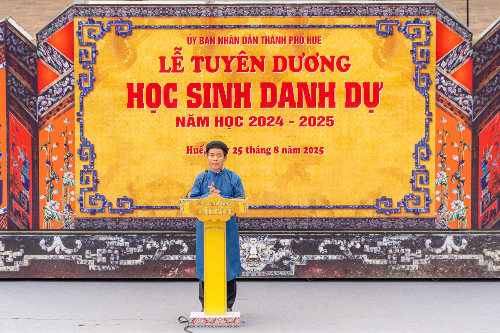 Phát biểu tại buổi lễ, Chủ tịch UBND Thành phố Huế Nguyễn Văn Phương đã gửi lời chúc mừng và biểu dương sự nỗ lực phấn đấu của các em học sinh ưu tú, có thành tích học tập xuất sắc toàn diện, đạt danh hiệu "Học sinh danh dự toàn trường" trong năm học vừa qua.