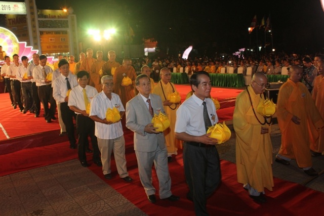 Dưới sự chủ trì của 3 Hòa thượng Chứng minh: Thích Huệ Ấn,Thích Lưu Hòa, Thích Giác Quang, đông đảo Tăng, Ni, đồng bào phật tử cùng quan khách đã tiến hành nghi lễ rước và thả hoa đăng tại Tòa tháp nổi cao 30m, mô phỏng theo mô hình đèn Quảng Chiếu được dựng trên sông Hương và cũng tại đây, Ban Tổ chức đã thực hiện phóng liên hoa đăng gồm: thiên đăng, địa đăng và thủy đăng với ý nghĩa mang ánh sáng Từ bi, Trí tuệ và Giải thoát của Đạo Phật nhằm đem lại an lành và phồn vinh cho mọi người.