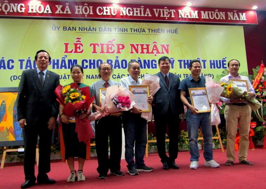 | Lãnh đạo tỉnh, sở VHTT trao giấy chứng nhận cho các cá nhân tặng tác phẩm cho Bảo tàng Mỹ thuật Huế |