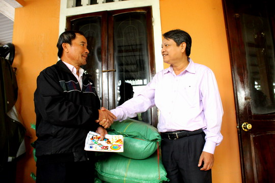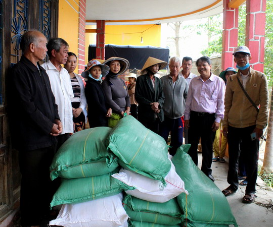 Nhà văn Hồ Đăng Thanh Ngọc - Chủ tịch Liên hiệp các Hội VHNT Thừa Thiên Huế trao gạo cho người dân thôn Lê Xá Trung