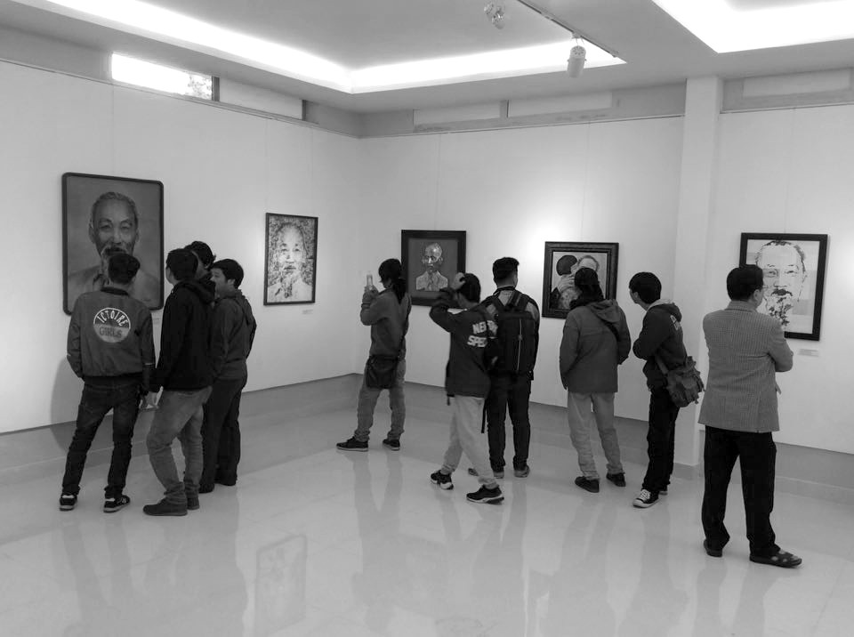 Trong dòng chảy tôn kính đó, cuối tháng 11/2017 vừa qua, Đảng ủy Trường Đại học Nghệ thuật Huế đã tổ chức trưng bày tranh tượng sáng tác “Bác Hồ của chúng ta”. 40 tác phẩm được chọn triển lãm là sự tôn kính Bác sâu sắc của thầy và trò nhà trường, hướng về giá trị đạo đức, nhân cách, tác phong, tư tưởng Hồ Chí Minh.