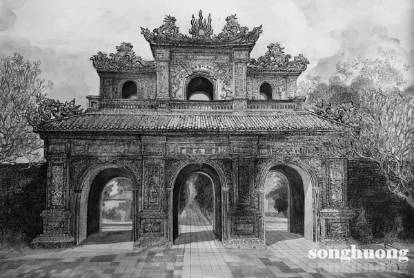 Tác phẩm Hiển Nhơn Môn, chất liệu bút sắt, Tô Trần Bích Thúy [Hình 2]. Cửa Hiển Nhơn nằm ở phía Đông của hoàng thành chỉ dành riêng cho quan lại và nam giới ra vào Đại nội khi xưa. Bút sắt là phương tiện tạo hình thuận tiện cho họa sĩ sáng tạo, một thể loại bút pháp có ưu thế để đẩy sâu kỹ năng diễn tả, mang lại hiệu quả đậm nhạt bằng phương pháp tổ hợp nét vẽ, tạo thành ngôn ngữ tạo hình của chất liệu bút sắt. Dấu ấn của mỗi họa sĩ đều được định hình từ bút pháp cá nhân, họa sĩ Tô Trần Bích Thúy đã thể hiện Hiển Nhơn Môn với sự đặt bút chuyên tâm, cần mẫn cùng kỹ thuật vẽ bút sắt tinh tế, điêu luyện, sử dụng các loại bút bi, bút kim màu đen diễn tả có hiệu quả trong lối vẽ, tạo chất cảm và chất chứa cảm xúc trong không gian sâu thẳm, để lại dấu ấn đậm nét kiến trúc xưa bên hoàng thành ở Huế.