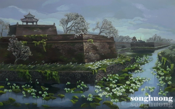 Tác phẩm Hộ Thành Hà và Vọng Lâu, chất liệu Acrylic, Nguyễn Thị Hải Hòa [Hình 3]. Hộ Thành Hà trong tác phẩm thể hiện góc phía nam của hộ thành hào, lũy thành có con kênh bao quanh là tuyến của phòng thủ có chức năng bảo vệ hoàng cung, phòng thủ huyền hồ trong khung cảnh lũy thành uy nghi của kinh thành cổ kính; Vọng Lâu - Quan Tượng Đài là công trình dạng đài thiên văn được ghi nhận trong lịch sử phong kiến Việt Nam và là công trình duy nhất còn lại dấu tích có ý nghĩa của kinh thành Huế xưa. Tác phẩm Hộ Thành Hà và Vọng Lâu xây dựng bố cục dàn ngang, bờ tường thành rêu phong được sắp xếp thành tuyến chính, trên đỉnh là vọng lâu, và cây hoa sứ, chân thành cổ là những bụi hoa lau, bên dưới kênh hào diễn tả đầm hoa sen. Phương cách tạo hình có bút pháp diễn tả đơn giản trong từng nét cọ tạo nên chất thơ dạt dào cảm xúc, nhẹ nhàng trong gam màu lạnh, hiệu quả về không gian xa gần cảnh vật hiện lên như buổi bình minh trong lành, tôn lên sức mạnh phòng thủ huyền hồ trong khung cảnh lũy thành uy nghi của kinh thành cổ kính.