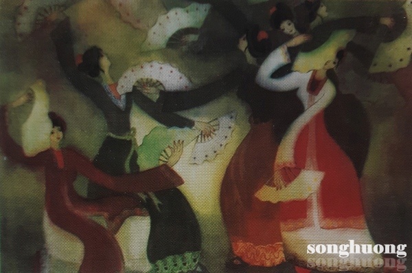 Tác phẩm Ngẫu hứng cung đình, chất liệu lụa, Phan Thị Kim Chi [Hình 5]. Múa hát cung đình Huế chủ yếu phục vụ cho vua chúa, trọng lễ trong triều đình, một hình thức lễ nghi phong kiến vương triều. Ngẫu hứng cung đình sử dụng phương pháp tạo hình vẽ mảng và nét kết hợp, các thủ pháp nghệ thuật khi khai thác chất liệu lụa truyền thống, những sợi tơ lụa, khi được ngấm màu sẽ hiệu ứng sống động chất loang màu sau khi được rửa lụa và tô lại nhiều lần sẽ sâu và êm dịu. Chất liệu lụa với đặc thù nhẹ nhàng, tinh tế tạo ra sự biểu cảm mềm mại đằm thắm về sắc độ gam màu, các yếu tố tạo hình về bố cục, hình, nét, mảng khái quát đơn giản, vừa là chất liệu truyền thống cũng là chất liệu biểu đạt cảm xúc hư ảo, mang giá trị nghệ thuật hiện đại trong tranh lụa ở Huế. Ngẫu hứng cung đình diễn tả các vũ công cầm quạt, dáng hình theo điệu múa uyển chuyển, sự kết hợp nhuần nhuyễn giữa các động tác múa tạo thành nhịp điệu của hình, là sự di chuyển đội hình theo các tuyến cùng điệu nhạc, mang nét đặc trưng của vũ khúc cung đình Huế, là sản phẩm mang tính kế thừa và kết lại dưới thời nhà Nguyễn đang tồn tại trong di sản văn hóa Cố đô.