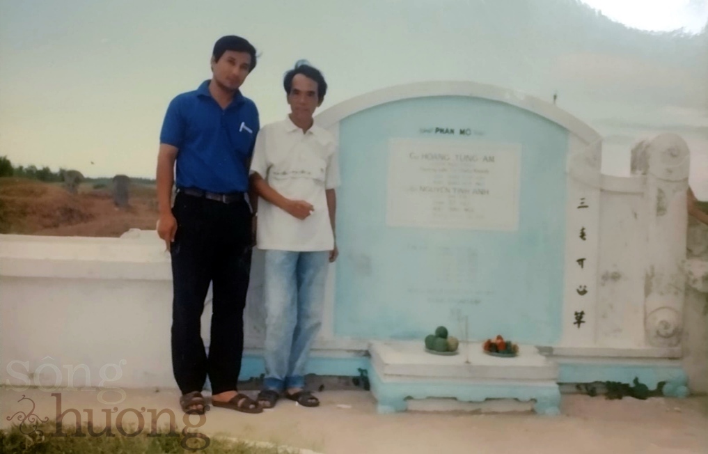 | Nhà văn Hoàng Phủ Ngọc Tường và nhà báo Dương Phước Thu trong một lần ra thắp hương tại nơi an nghỉ của cụ nội tổ Hoàng Phủ ở làng Bích Khê, tỉnh Quảng Trị. |