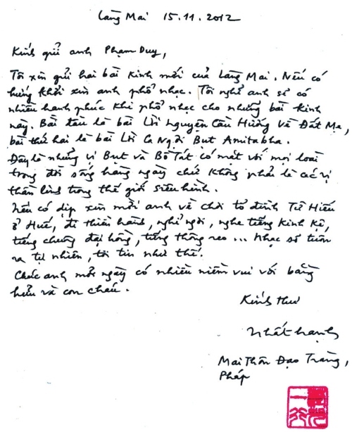 | Thư viết tay của Thiền sư Thích Nhất Hạnh viết từ Làng Mai đề ngày 15/11/2012, gởi NS Phạm Duy |