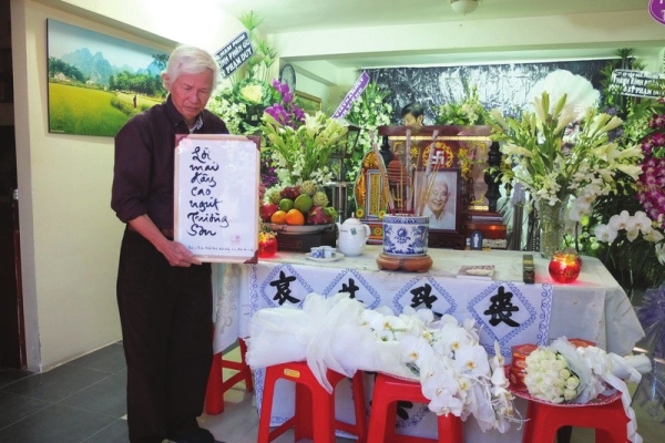 Lời điếu của Thầy được gia đình nhạc sĩ Phạm Duy kính cẩn đặt lên bàn thờ trước linh cữu của nhạc sĩ. Từ hôm đó, hàng trăm đoàn khách đến phúng viếng nhạc sĩ Phạm Duy đều được ghi hình với lời điếu thư pháp “Lời mai đây cao ngút Trường Sơn” ấy. Người được ghi hình đầu tiên là kỳ nữ nghệ sĩ Kim Cương.