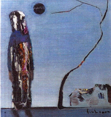 Cũng có khi cảnh và người hòa lẫn với nhau trong những biểu trưng đa dạng. Khi thì cô đơn lầm lũi của một thân lưu lạc đất khách quê người lầm lũi như bức ‘Chiều mưa tuyết’, ‘Người đi trong gió bấc’, hoặc nỗi cô quạnh nhớ cố hương như bức ‘Người ngồi chiều cuối năm’. Có khi là một thân người ngồi đổ gục xuống trong nỗi thống khổ vô biên như bức ‘Người trong nghịch cảnh’, có khi là một nỗi đau khổ xót xa khác của dân tị nạn với bức ‘Người ngậm kẽm gai’. Nhưng kinh dị nhất là bức ‘Rừng câm’ với hình người trắng xám lờ mờ như thể treo cổ hoặc là hình ảnh Chúa tuẫn nạn trên thập giá trên một nền xám đen sẫm pha chút lam, phía dưới loáng nước in bóng trời xanh, như thể bước ra từ một cơn ác mộng, có thể đó là ẩn dụ cho cái chết vì nỗi cô đơn, hoặc tuẫn tiết bởi chính cái đẹp ước mơ hoàn hảo của chính người nghệ sĩ. Các bức ‘Trở về’ quê nhà thường có nét reo mơ mộng hoặc trầm mặc. Có bức ta nhìn thấy một hình người mà hình như lại hóa ra hai hình sóng đôi nhìn vào nhau như thể một cuộc trò chuyện giữa hai cái tôi hôm qua và hôm nay, cái tôi ra đi và cái tôi trở về như trong một cuộc hành hương kiếm tìm một điều gì quý báu nhất…