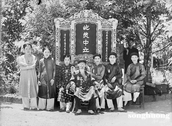 | Thượng thư Hồng Khẳng cùng các con mang áo dài tại Lạc Tịnh viên. Ảnh tư liệu |