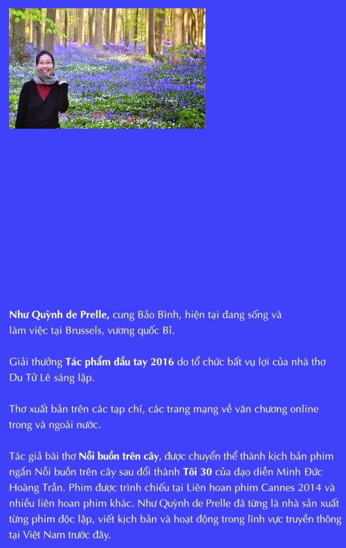 Trong thế giới thi ca, mỗi thi nhân đều chọn cho mình một thế giới riêng, với một cách thức ngõ lời riêng. Những cách thức ngõ lời ấy, có thể như lời của những dòng sông êm đềm, ngọn gió thênh thang, tiếng suối xa rì rào hay cánh đồng cỏ vi vu, cũng có thể là tiếng rên rỉ của côn trùng nhưng cũng có thể là tiếng thác ghềnh ầm vang hay tiếng sét đì đùng một chiều giông gió… Riêng với Như Quỳnh de Prelle, qua tập “Song Tử” - (dành cho những tưởng tượng trong thi ca)”, có cảm giác như nữ thi nhân này đã chọn cho mình cách thức ngõ lời bằng những dòng nham thạch.