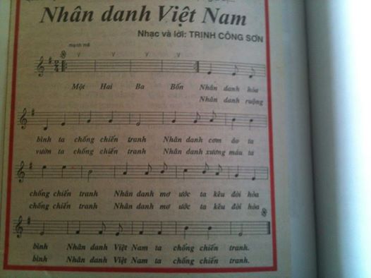 Tôi cầm bản nhạc, đọc lời: “Toàn thân em đã có vết bầm, trên da anh cc hình tra tn. Trên thân ch nhc nhn đau thương. Triệu bàn tay chúng ta bước đi trên mt tôi đòi. Trong tim mi người là mt đồng lúa mi. Ta hiên ngang bên thú mt người. Cht cùm xích cho quê hương mm cười...”.