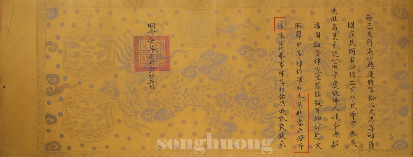 Tiếp tục khảo sát hệ thống sắc phong đang được lưu giữ tại làng Xuân Thiên, sẽ giúp chúng ta hiểu rõ hơn về quá trình thay đổi cấp và danh xưng hành chính của làng Xuân Thiên. Theo đó, trong bản sắc phong vào ngày 25 tháng 8 năm Minh Mạng thứ 7 (1826), ân ban cho thần hiệu “Kỷ Mùi khoa Tiến sĩ Phi Vận tướng quân Tùng Giang Văn Trung” (己未科進士飛運將軍松江文忠), xác nhận sự tồn tại địa danh: Đường Thiên Khách hộ phường (塘阡客戶坊). Vào thời điểm đó, Đường Thiên thuộc huyện Hương Trà.