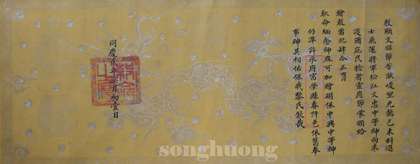 敕承天府, 富榮縣, 春阡邑奉事本土開耕阮氏條貴娘之神 , 稔著靈應。 肆今丕承耿命, 緬念神庥。著封為翊保中興靈扶之神, 準其奉事。庶幾神 其相 佑, 保我黎民。 欽哉。