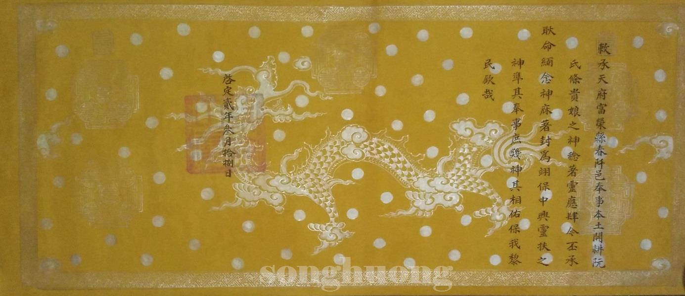 敕承天府, 富榮縣, 春阡邑從前奉事, 原贈翊保中興靈扶開耕阮氏條貴娘 尊神。 護國庇民, 稔著靈應。 節蒙頒給敕封, 準許奉事。肆今正値,朕四旬 大 慶節, 經頒寶詔覃恩, 禮隆登秩。 著加贈貞婉尊神, 特準奉事,用誌國慶而 申祀典。 欽哉。