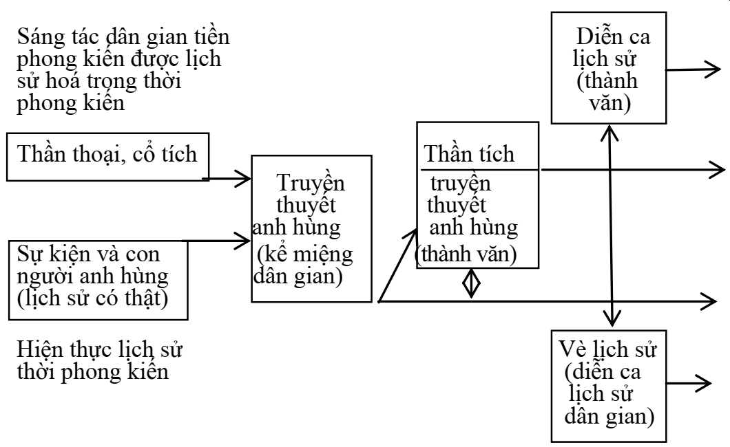 Sơ đồ cho thấy, nằm trong dòng chảy của các thể loại văn học dân gian, tiểu thể loại truyền thuyết anh hùng (trong đó chủ đạo là các anh hùng chống ngoại xâm, đã nói), chẳng những có quan hệ với thần thoại, truyện cổ tích, mà còn có quan hệ gần gũi với diễn ca và vè lịch sử. Tài liệu trên nói rõ hơn: nguồn gốc cấu tạo của truyền thuyết anh hùng gồm có hai bộ phận: bộ phận thứ nhất là hiện thực lịch sử thời phong kiến (sự kiện và con người anh hùng lịch sử có thật); bộ phận thứ hai là sáng tác dân gian truyền thống tiền phong kiến (thần thoại và cổ tích).