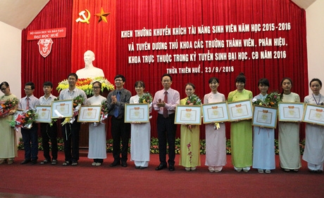 Đại học Huế vừa tổ chức buổi lễ khen thưởng khuyến khích tài năng sinh viên năm học 2015 - 2016 và tuyên dương các thủ khoa của các trường, phân hiệu, khoa trực thuộc kỳ tuyển sinh đại học, cao đẳng hệ chính quy năm 2016.