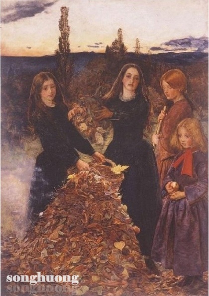 Tác phẩm “Lá mùa thu” (1856) của danh họa người Anh John Everett Millais, lại đem tới cho người xem những cảm xúc khác về mùa thu. Trong tác phẩm này, dường như không chủ ý đi tới mô tả cái đẹp của thiên nhiên mà ở đây, tác giả nỗ lực mô tả cảm xúc của các nhân vật trong tranh. Cụ thể, hình ảnh trung tâm ở đây là bốn cô gái đang đổ lá vàng từ trong những chiếc giỏ thành một đống lá lớn trên mặt đất. Nhìn vào khuôn mặt của bốn cô gái trẻ chúng ta nhận thấy không khí dường như bị chùng xuống, một cảm giác buồn bã bao trùm lên con người và cảnh vật. Trong tranh của John Everett Millais, thường gắn sự mơ mộng, hoang tưởng, kỳ ảo, liêu trai và cái tàn lụi.