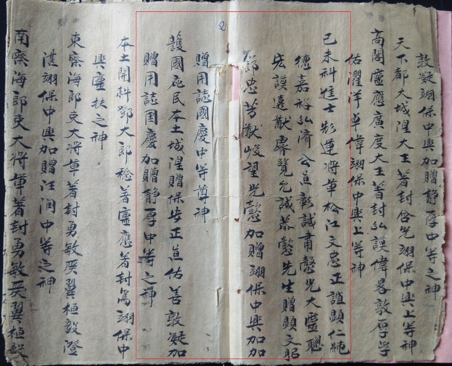 大乾國家南海妙應顯佑默相嚴良誠哲普明穎達昊恩疊德廣大高明博厚昭應普化玄虛四位聖娘王, 著封含弘光大至德溥博顯化莊徽翊保中興上等神。 當境城隍上宰 輔國大王, 著封保安正直佑善敦凝翊保中興, 加贈靜厚中等神。 天下都大城隍大王, 著 封含光翊保中興上等神。 高閣靈應廣度大王, 著封弘謨偉略敦厚孚佑濯洋卓偉翊保 中興上等神。 己未科進士飛運將軍松江文忠正誼顯仁沌德嘉裕弘濟公直彰誠肅懿光 大靈聰宏謨遠猷睿覽克誠恭懿先生, 贈顯文昭節忠芳猷峻望光懿, 加贈翊保中興, 加贈 用誌國慶中等神。 護國庇民本土城隍, 贈保安正直佑善敦凝加贈用誌國慶, 加贈靜厚 中等神。 本土開耕鄧大郎, 稔著靈應, 著封為翊保中興靈扶 之神。 東察海郎吏將軍, 著封勇敏嚴翼宣毅澄湛翊保中興, 加贈汪潤中等 神。 南察海郎吏大將軍, 著封勇敏嚴 翼宣毅澄湛翊保中興, 加贈汪潤中等 神。 蘇大僚, 胡大將。 四頭茄琴三位彈娘護國庇 民稔著靈應, 著封為翊保中興靈扶之神, 加贈莊徽上等神。 今年行譴行瘟行兵之神。 山川岳瀆河伯水官之神。 九天玄女聖祖元君, 贈翊保中興, 加贈用誌國慶尊神。 西陵 氏馬頭天僊稔著靈應, 著封為翊保中興靈扶之神, 加贈貞婉尊神。天依阿那主玉衍妃 慈淑夫人, 著封弘惠普濟靈感妙通默相莊徽翊保中興上等神。 五行列位, 著封贊化默 蓮順成和序資元粹穆翊保中興上等神。公子二 位, 稔著靈應, 著封為翊保中興靈扶之 神, 加贈卓偉上等神。 本土開墾鄧貴公, 稔著靈應, 著封為翊保中興靈扶之神。