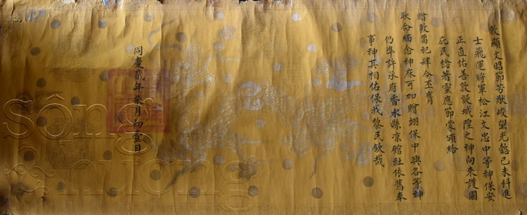 - Bổn thổ Khai khẩn Đặng quý công linh ứng rõ rệt, phong tặng [mỹ tự] Dực bảo Trung hưng Linh phò chi thần.