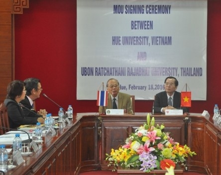 Tại Đại học Huế, PGS.TS. Nguyễn Văn Toàn, Giám đốc Đại học Huế và PGS. Prachoom Pongpan, Hiệu trưởng Trường Đại học Hoàng Gia Ubon Ratchathani vừa tổ chức ký kết biên bản ghi nhớ hợp tác giữa hai đại học.