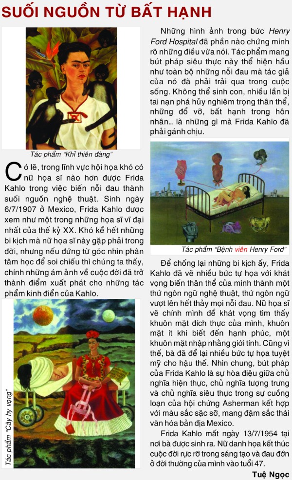 Có lẽ, trong lĩnh vực hội họa khó có nữ họa sĩ nào hơn được Frida Kahlo trong việc biến nỗi đau thành suối nguồn nghệ thuật.