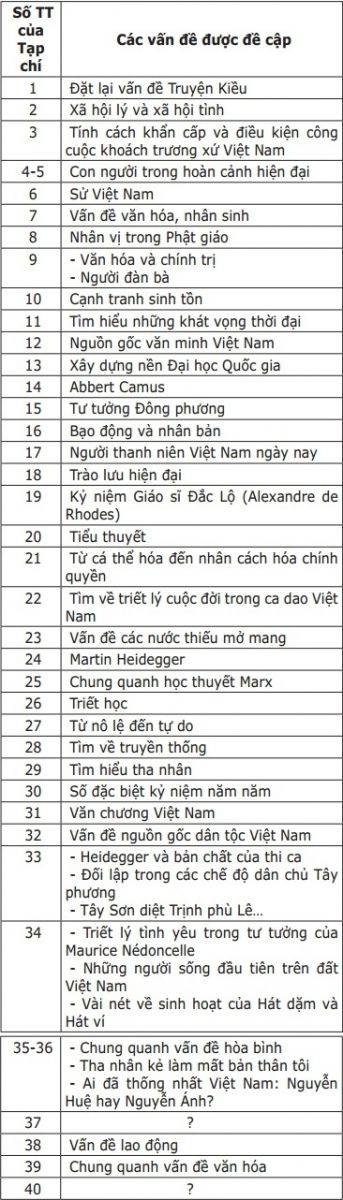 Riêng về chủ đề nội dung của hai số 37 và 40, không thấy được ghi ở nơi nào cả. Cho nên, dưới đây xin chép lại nhan đề của các bài viết đã được nêu bật ở bìa 1 của hai số Tạp chí đó.