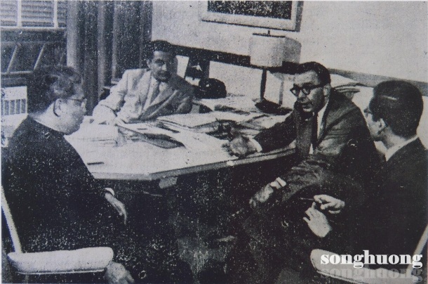 | Linh mục Viện trưởng Cao Văn Luận và Tổng thư ký của Viện là Lê Thanh Minh Châu trong cuộc hội đàm cùng các nhân vật cao cấp của Đại học Michigan (Mỹ) năm 1958. Ảnh chụp lại từ Tạp chí Đại Học, số 7, trang 125. |