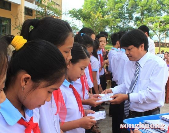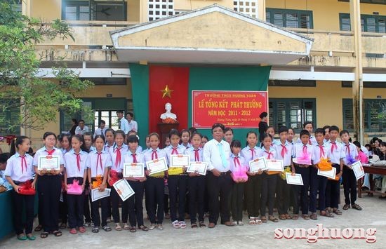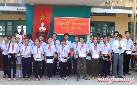 SHO - Nhằm giúp đỡ và chia sẻ một phần khó khăn để các em học sinh tiếp tục vươn lên học tốt, sáng ngày 29/5, Tạp chí Sông Hương đã trao 20 suất học bổng cho các em học sinh Trường Trung học cơ sở Hương Toàn (thị xã Hương Trà, tỉnh Thừa Thiên Huế) tại buổi Lễ Tổng kết và phát thưởng năm học 2011- 2012 của nhà trường.