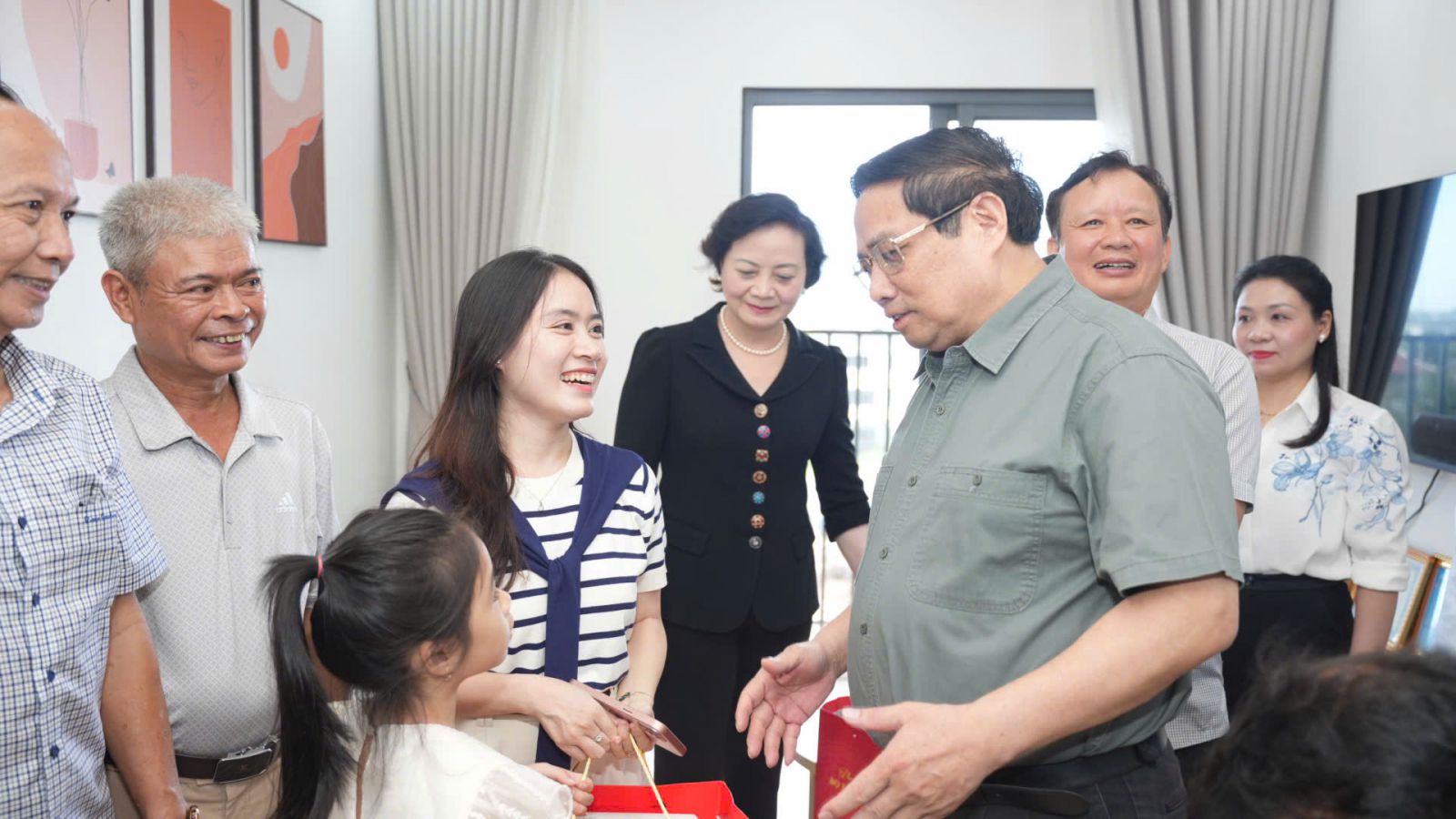 Thăm hỏi, tặng quà các hộ dân, Thủ tướng Chính phủ Phạm Minh Chính phấn khởi trước những căn hộ khá khang trang với hạ tầng đồng bộ, cư dân tại khu nhà ở xã hội sử dụng chung nhiều hạ tầng với khu đô thị; và đánh giá cao nỗ lực, cách làm của địa phương, chủ đầu tư trong triển khai các dự án nhà ở xã hội.