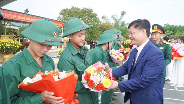 | Đồng chí Lê Trường Lưu - Ủy viên Trung ương Đảng, Bí thư Tỉnh ủy, Chủ tịch HĐND tỉnh, Trưởng Đoàn đại biểu Quốc hội tỉnh tặng hoa động viên các tân binh nhập ngũ |
