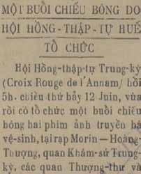 Trên Tràng An Báo số ra ngày 18/6/1937, có đưa tin: “Một buổi chiều bóng do Hội Hồng Thập tự Huế tổ chức”, nội dung như sau: “Hội Hồng Thập tự Trung kỳ (Croix Rouge de l’Annam) hồi năm giờ chiều thứ bảy 12 Juin, vừa rồi có tổ chức một buổi chiếu bóng hai phim ảnh truyền bá vệ sinh tại rạp một Hoàng Thượng, quan Khâm sứ Trung kỳ, các quan Thượng thư và nhiều quý quan bên Bảo hộ có tới dự.
