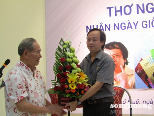 | Nhà văn Nguyễn Quang Hà tặng hoa cho con trai cố nhà thơ Ngô Minh |