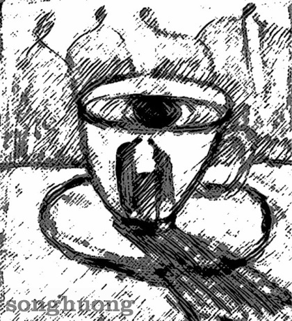 Còn trong mắt cà phê, vời vợi những viên đường...