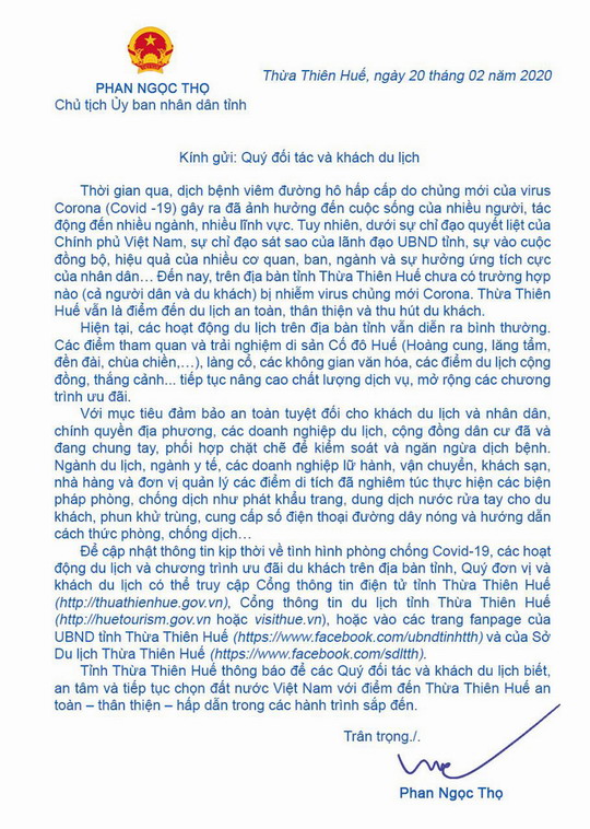 Đó là thông điêọ của Chủ tịch UBND tỉnh Phan Ngọc Thọ trong thư gửi  đến các đối tác và khách du lịch ngày 20/02/2020.