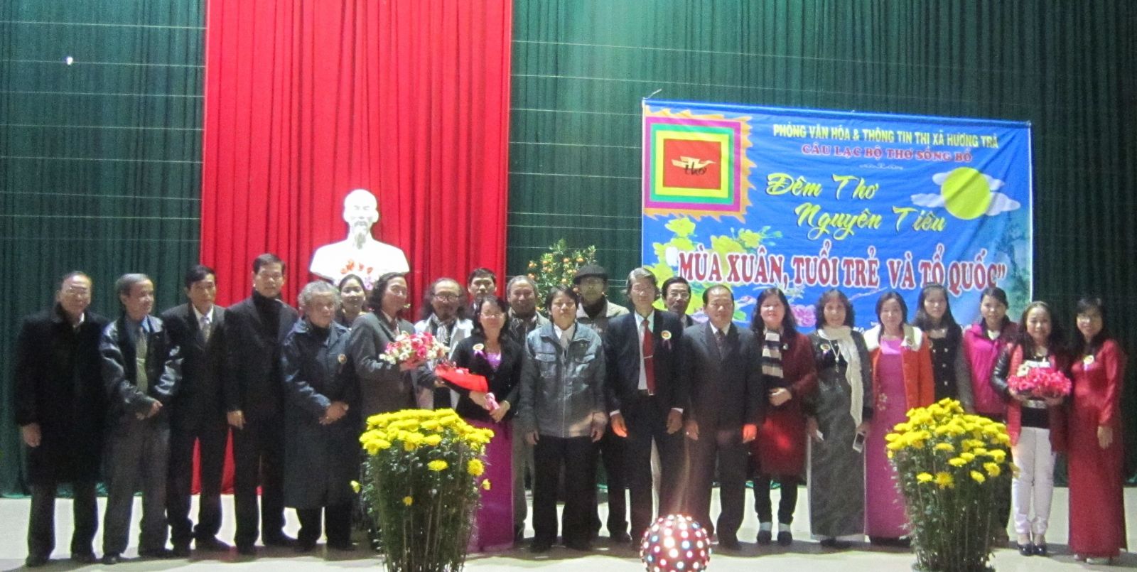 Trong không khí ngập tràn xuân rằm tháng Giêng, tối 15/2, Câu Lạc Bộ Thơ Sông Bồ (thuộc Phòng VHTT Thị xã Hương Trà) đã tổ chức Đêm thơ Nguyên Tiêu tại Thị trấn Tứ Hạ. Đến dự, ngoài lãnh đạo huyện Hương Trà, còn có đông đảo các nhà văn, nhà thơ đến từ Lien hiệp Các Hội VHNT tỉnh, Hột thơ Hương Giang, CLB Hương Thơ Xứ Huế, CLB thơ Hương Xuân, CLB thở Thuận Lộc, CLB thơ Bến Hẹn – Huế, CLB thơ Tam Giang.