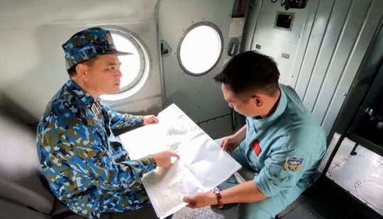 | Phi công bàn phương án cứu hộ trên trực thăng. Ảnh: Trần Hoài |
