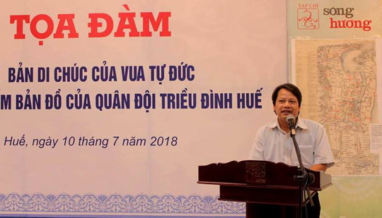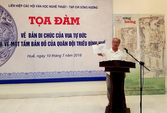 Chiều ngày 10/7, Liên hiệp các hội Văn học nghệ thuật Thừa Thiên Huế phối hợp với Tạp chí Sông Hương tổ chức buổi tọa đàm “Về bản di chúc của vua Tự Đức và về một tấm bản đồ của quân đội triều Nguyễn” do nhà nghiên cứu, diễn giả Trần Viết Ngạ trình bày, diễn ra tại Tòa soạn Tạp chí, số 9 Phạm Hồng Thái, thành phố Huế.