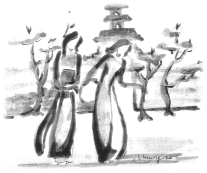 Bên bóng đền đài ngồi nhớ trăm năm, rêu thở hư vô xanh từ tiền kiếp