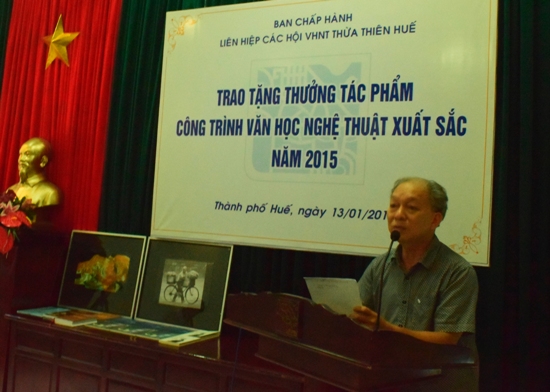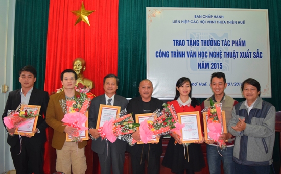 Chiều ngày 13/1, tại 26 Lê Lợi (thành phố Huế), Liên hiệp các Hội VHNT Thừa Thiên Huế đã tổ chức Lễ trao tặng thưởng tác phẩm, công trình Văn học Nghệ thuật xuất sắc năm 2015 cho 16 tác phẩm, công trình của các tác giả là hội viên các Hội chuyên ngành.