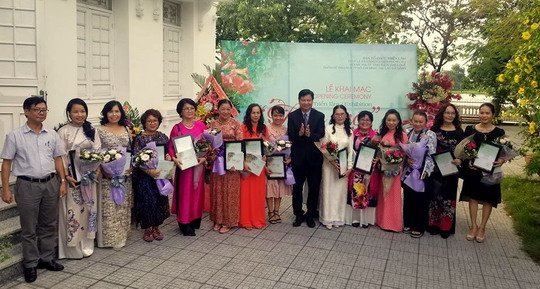 | Ông Nguyễn Dung - Phó chủ tịch UBND Tỉnh Thừa Thiên Huế và ông Cao Chí Hải - Phó GĐ Sở VHTT Thừa Thiên Huế trao giấy chứng nhận triển lãm cho các nữu họa sĩ |
