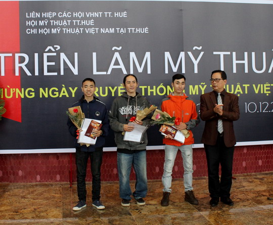 | Nhà thơ Lê Vĩnh Thái - Phó chủ tịch Liên hiệp các hội VHNT Thừa Thiên Huế - Tổng Biên tập Tạp chí Sông Hương trao hoa chúc mừng các họa sĩ được đề cứ tham gia giải thưởng VHNT |