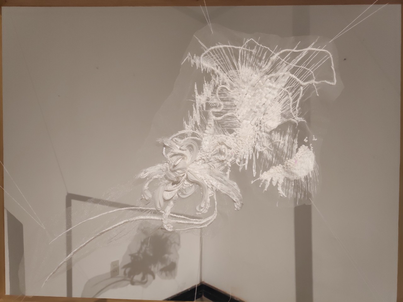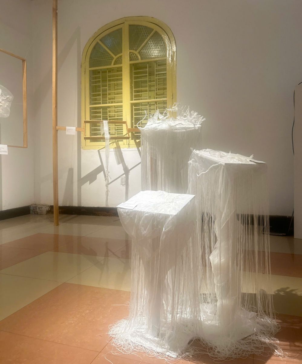 Tại không gian trưng bày, công chúng đã được chiêm ngưỡng tác phẩm độc đáo “Tiêu bản cắt 6 lớp” – một ẩn dụ thị giác cho quá trình tái cấu trúc di sản. Tác phẩm được bóc tách thành 6 lát cắt, tái hiện hành trình xuyên suốt các làng nghề thêu truyền thống trứ danh miền Bắc – Trung bộ, từ thêu long bào ở Đông Cứu đến thêu tranh ở Quất Động. Qua lăng kính sáng tạo “Khắc – Khảm – Cắt”, nghệ thuật thêu được khoác lên diện mạo mới, vừa tôn vinh giá trị cổ truyền vừa khơi gợi tư duy đương đại.