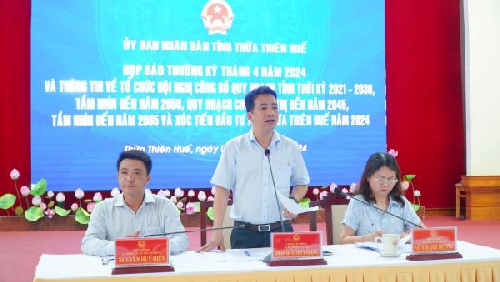 Chiều ngày 03/4, UBND tỉnh tổ chức họp báo thường kỳ tháng 4/2024 và thông tin về tổ chức Hội nghị công bố Quy hoạch tỉnh thời kỳ 2021-2030, tầm nhìn đến năm 2050; Quy hoạch chung đô thị Thừa Thiên Huế đến năm 2045, tầm nhìn đến năm 2065 và xúc tiến đầu tư tỉnh Thừa Thiên Huế năm 2024.