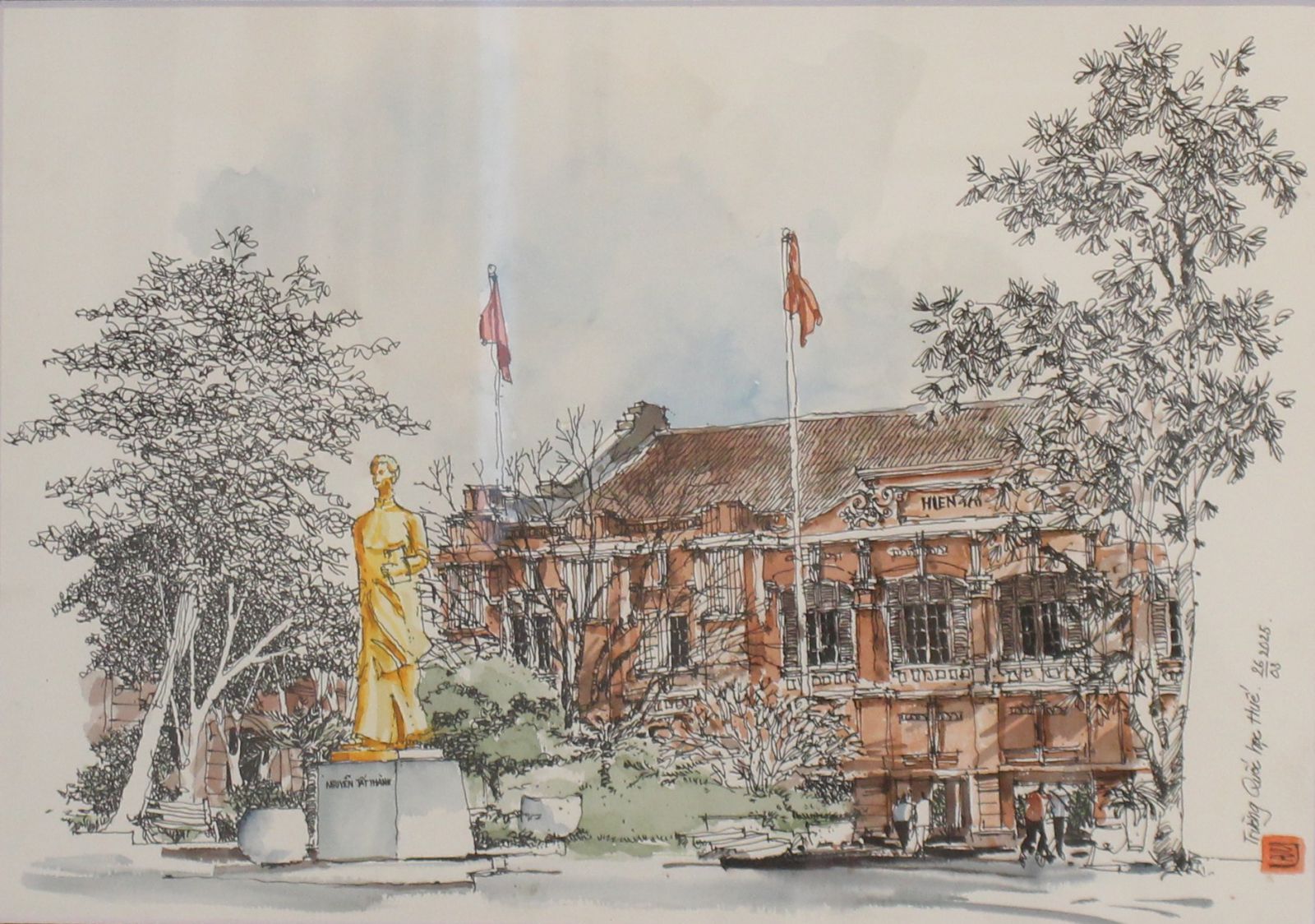 Trường Quốc Học Huế - Ký họa bút sắt, màu nước - Họa sĩ Nguyễn Hoàng Lâm