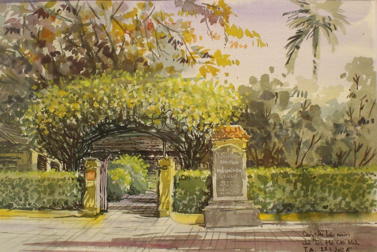 Cổng nhà lưu niệm Chủ tịch Hồ Chí Minh 158 Mai Thúc Loan - Màu nước - Họa sĩ Đinh Thế Anh