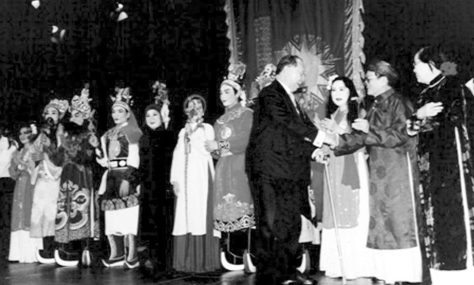 | GS. Trần Văn Khê thăm hỏi các nghệ sĩ tuồng trước giờ biểu diễn Đông Lộ Địch |