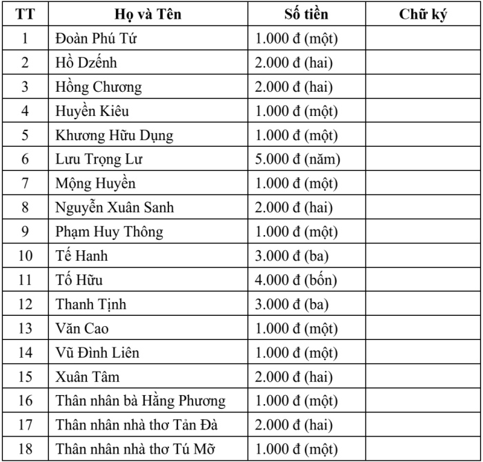 | Bản trả nhuận bút tác giả cuốn sách “Bài thơ thôn Vỹ”, có chữ ký của các nhà văn, nhà thơ. (Ảnh tư liệu của nhà văn Trần Phương Trà). |